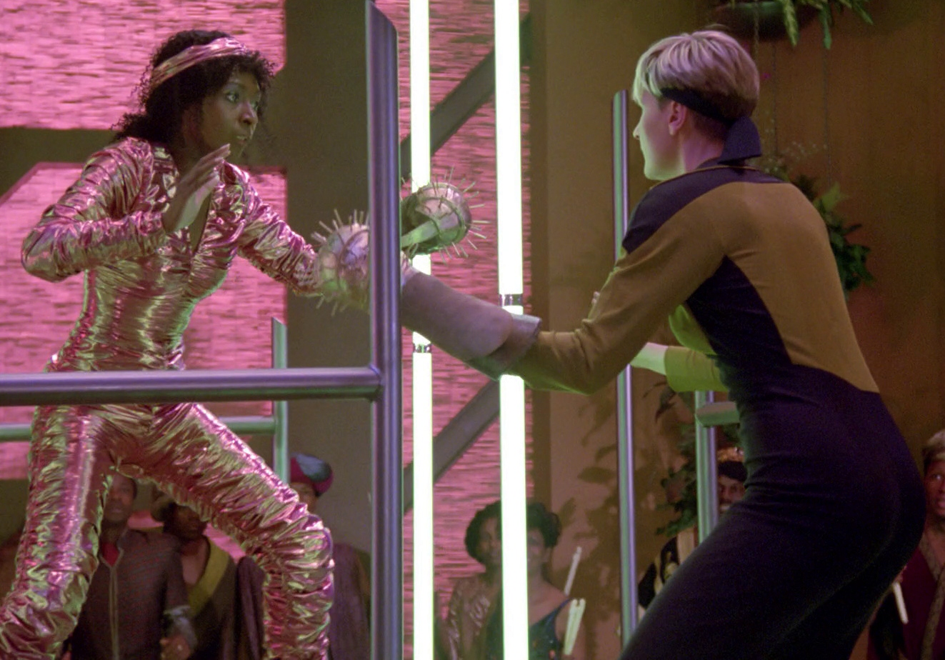 What on earth was Commander Troi wearing? I'm fairly certain that that's not Starfleet issue...